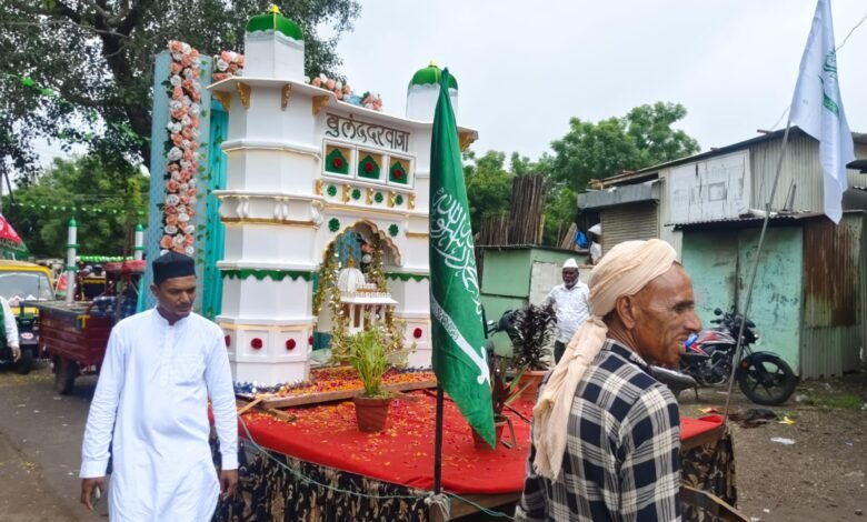 सकाळी नऊ वाजता गांधी चौकातुन निघालेल्या या मिरवणुकीत शहराच्या प्रत्येक मस्जीद मधुन आलेल्या मिरवणुका व मुस्लीम समाजाचे नागरिक मोठ्या संख्येने सहभागी झाले होते. सुमारे तिन किलोमिटर लांबीच्या या मिरवणुकीत विविध धार्मीक प्रसंगाची आठवण करुन देणाऱ्या ट्रॅक्टर वर सजवीलेल्या प्रतिकृती, घोडा बग्गी, ॲटो, कार आदि सहभागी झाले होते तर, डिजेच्या धार्मीक गाण्यावर झेंडे फडकावुन आनंद व्यक्त करणाऱ्या युवकांनी यात चांगलाच रंग भरला होता.